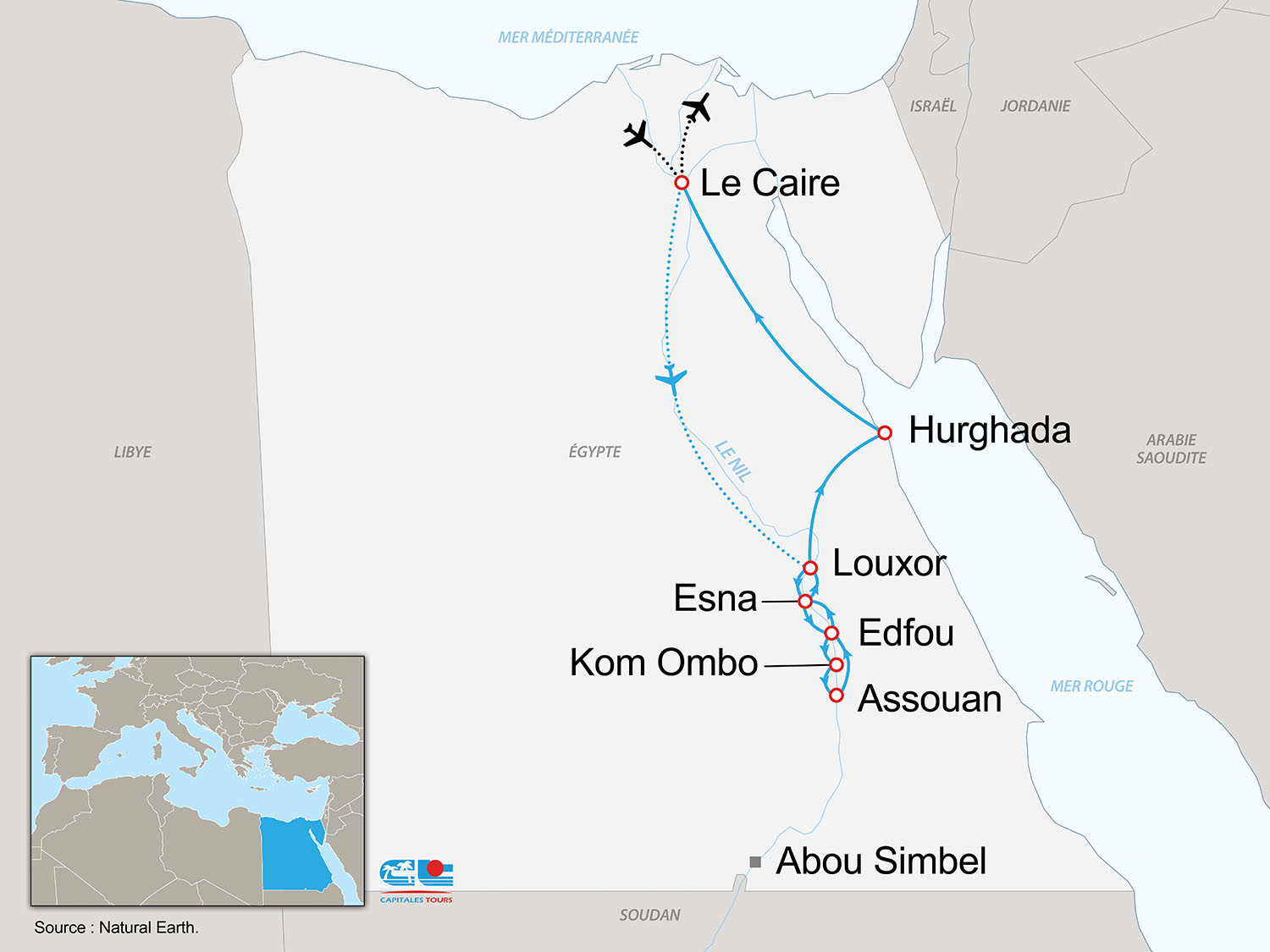 • Aérien : France / Le Caire et Hurghada / France sur vol régulier Turkish Airlines via Istanbul (les vols sur l’Egypte peuvent être de jour comme de nuit)