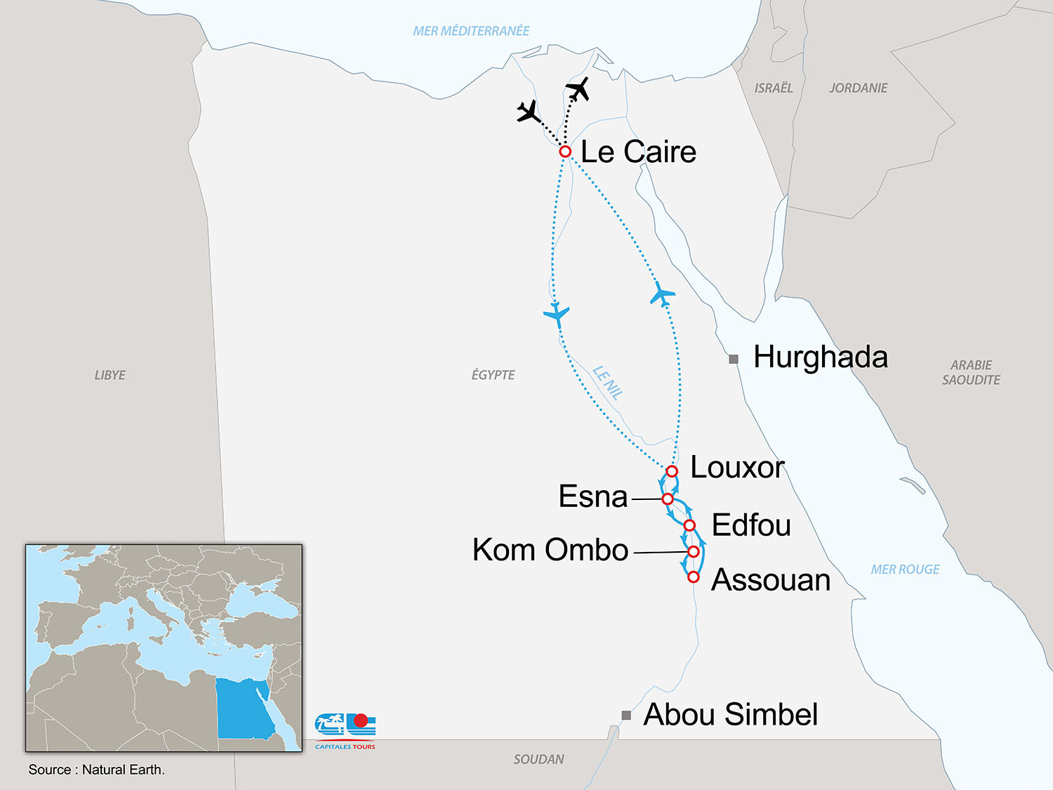 Si le départ de Paris est un mercredi, le programme commencera avec 3 nuits au Caire puis les 7 nuits de croisière.