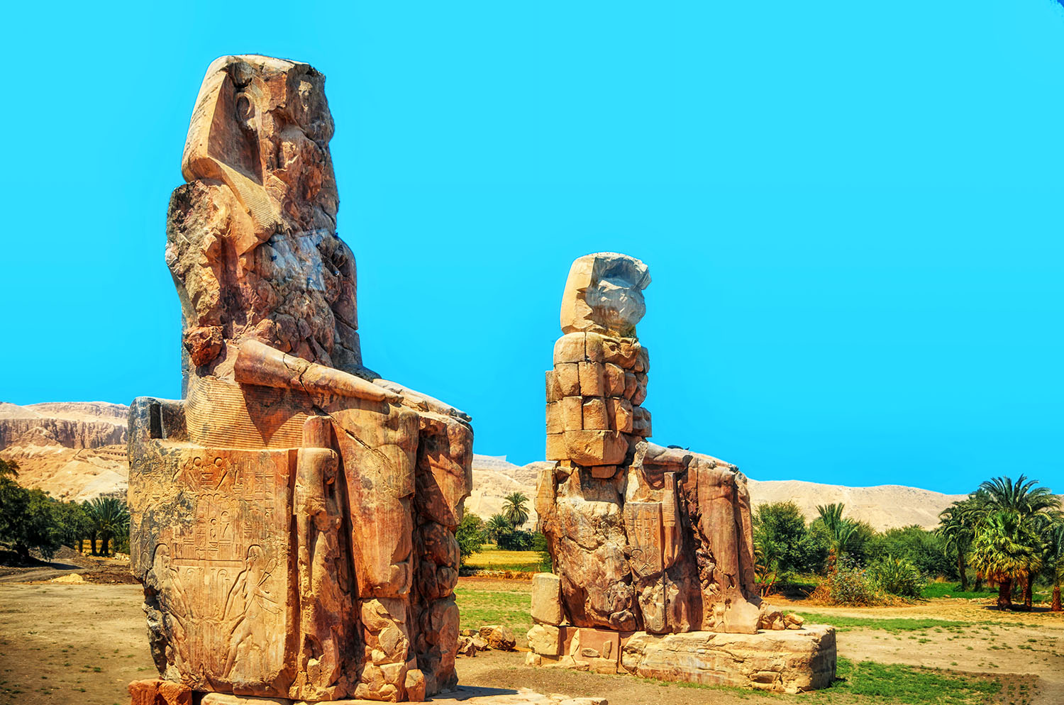 Arrêt aux Colosses de Memnon, seuls monuments funéraires d’Aménophis III. Ils sont connus pour leur architecture imposante, ces vestiges furent visités par les empereurs, les voyageurs de toutes époques. Hauts de 18 m et pesant 1300 tonnes, ils seront baptisés Colosses de MEMNON par les Grecs à cause de la légende de l'Oracle de Memnon.