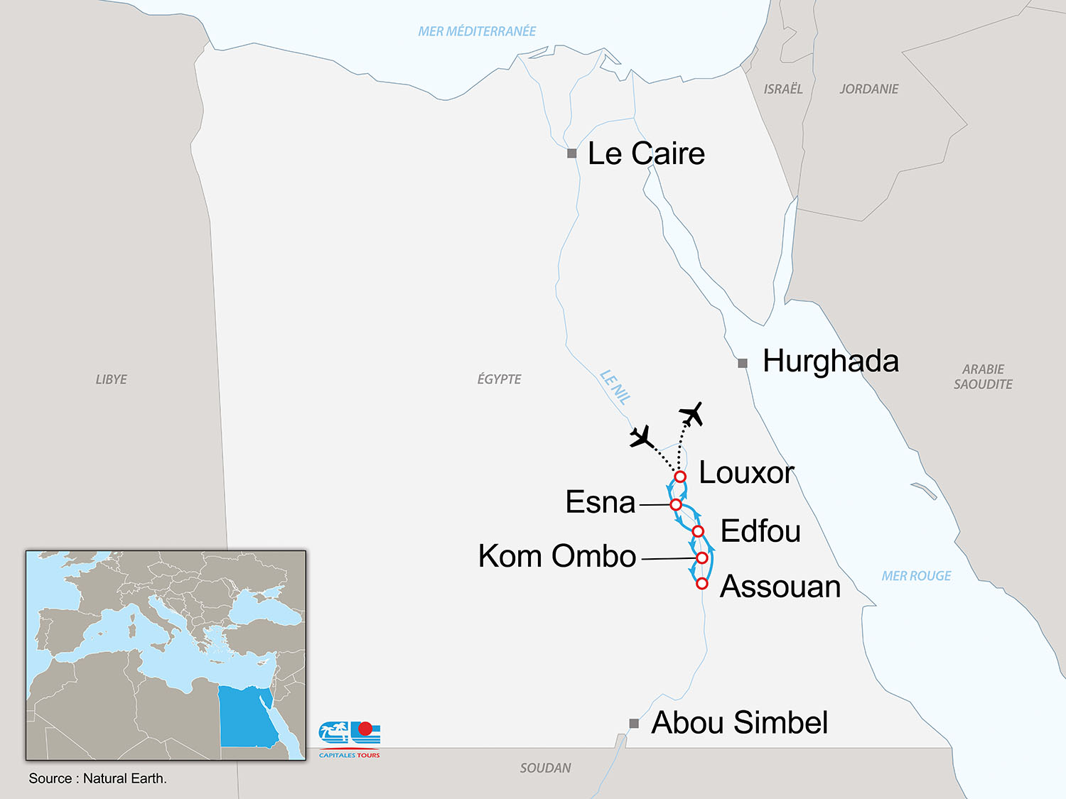 • Aérien : France / Louxor / France sur vols spéciaux Air Cairo, Fly Egypt, ASL Airlines ou Air Arabia (les vols sur l’Egypte peuvent être de jour comme de nuit)