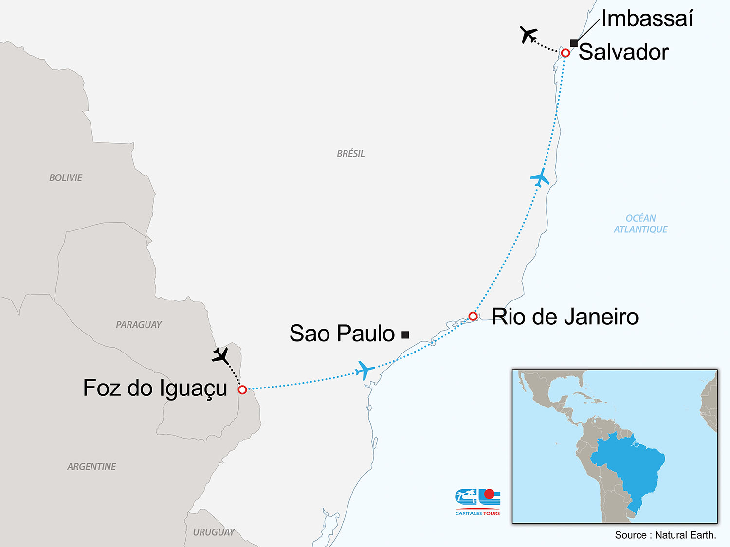 Découvrez les sites emblématiques du Brésil, le centre historique de Salvador de Bahia, les incontournables chutes d’Iguazu côté Brésilien et Argentin, le pain de sucre et le célèbre Corcovado à Rio…