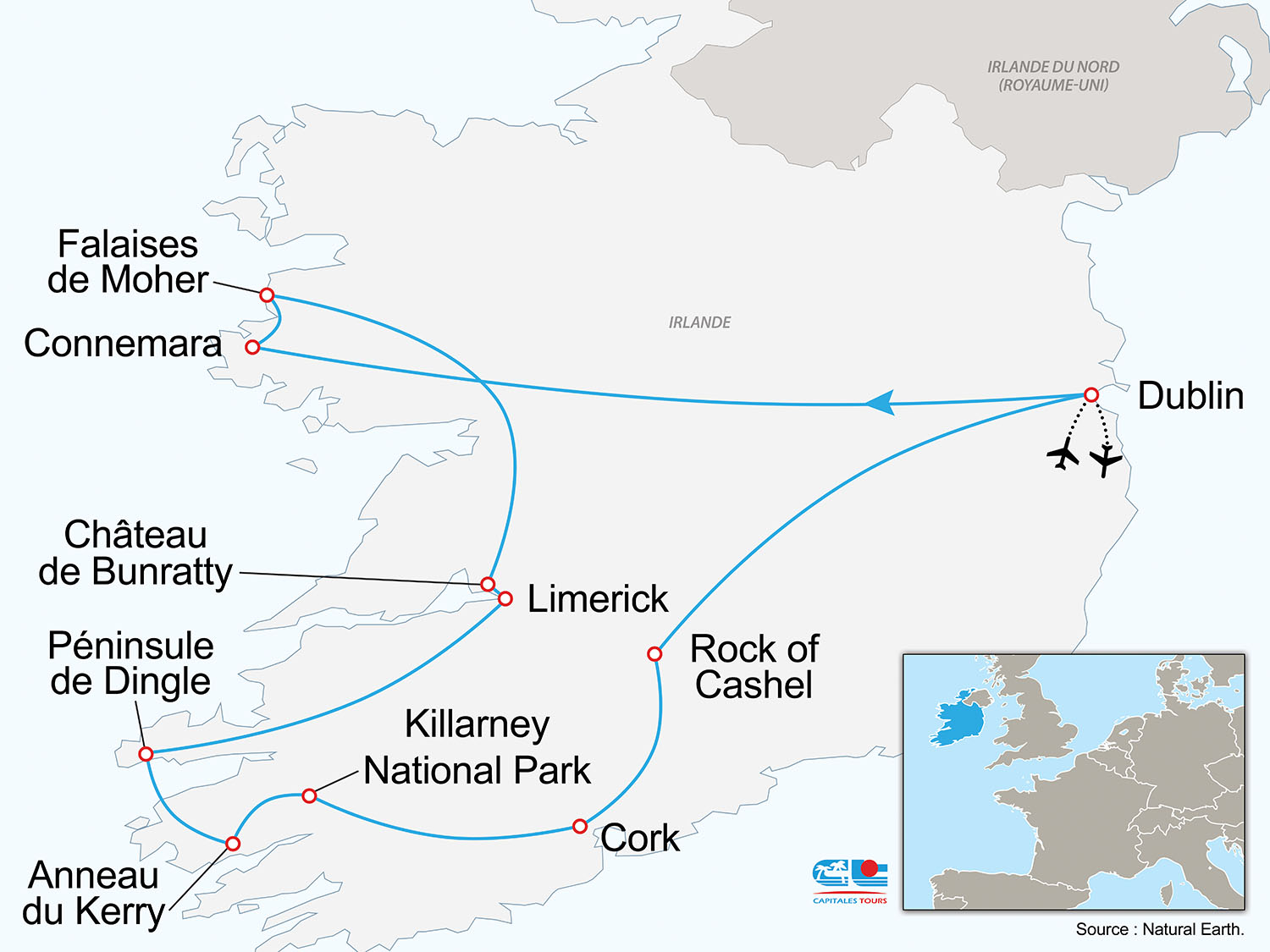• Aérien : France / Dublin / France sur vols réguliers ou low-cost Aer Lingus, Air France/KLM, Vueling ou Transavia