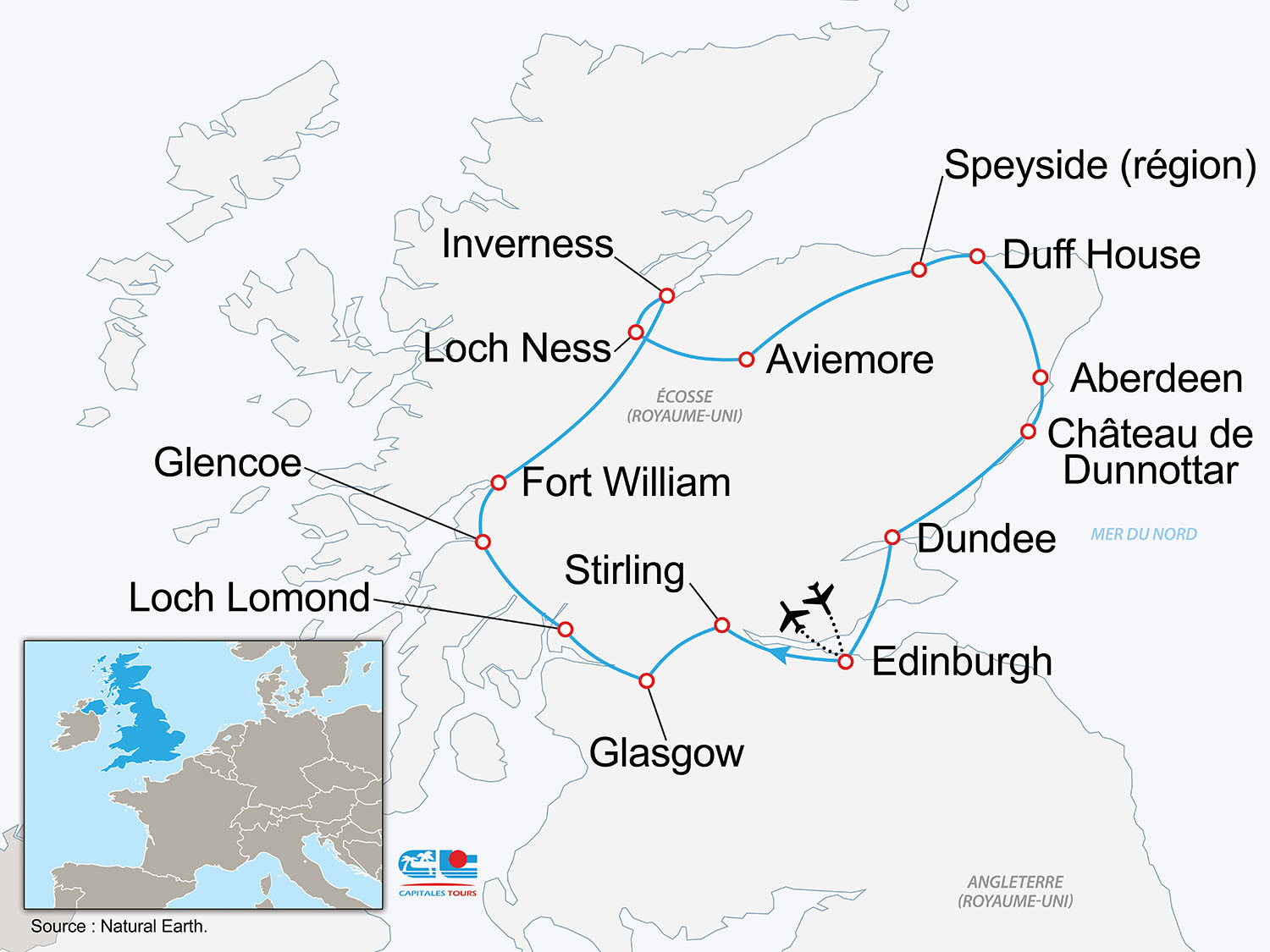 • Aérien : France / Edimbourg / France sur vols réguliers Air France/KLM ou vols du groupe Lufthansa (les vols peuvent être avec ou sans escale à l’aller comme au retour)