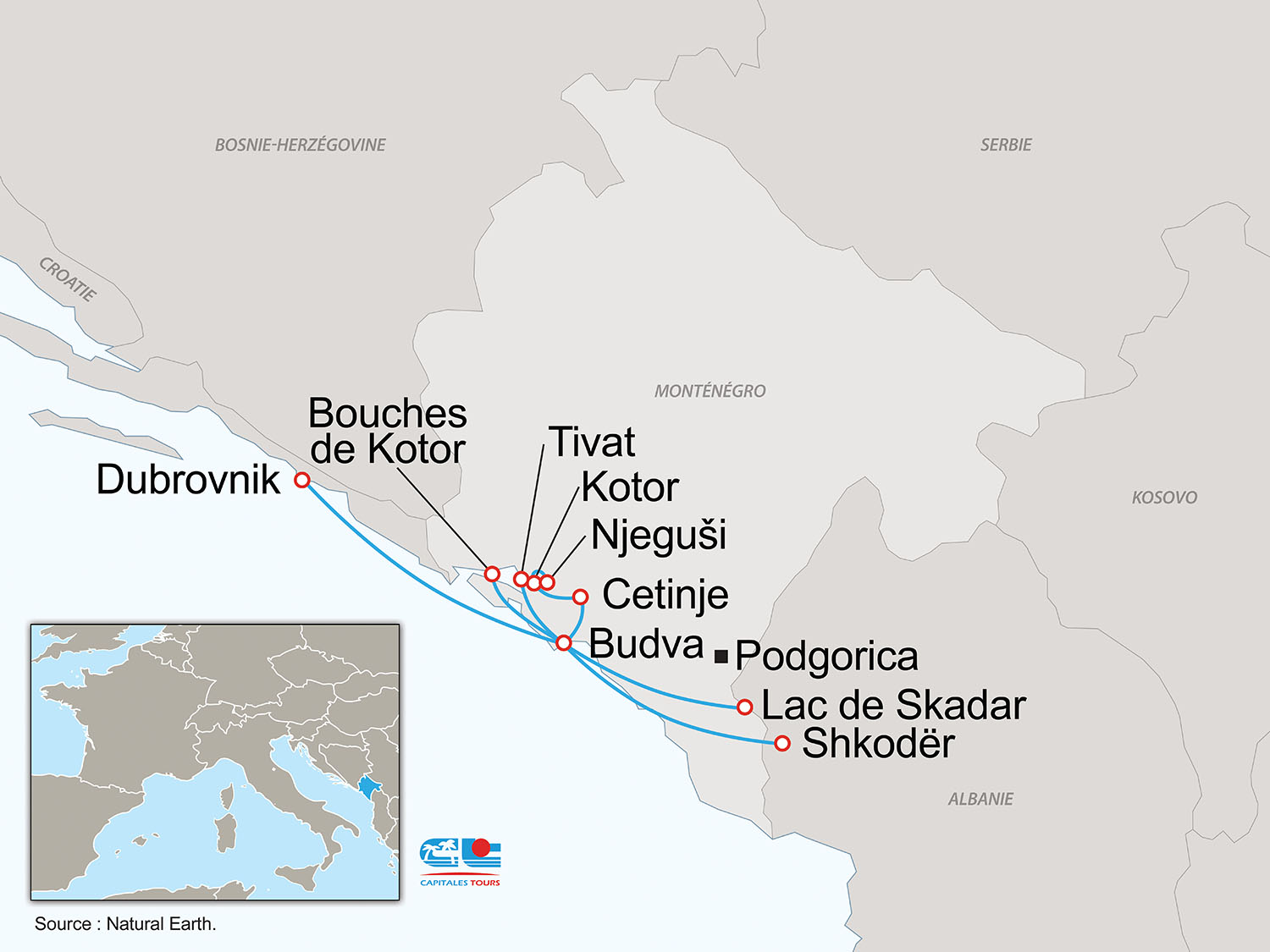• Aérien : Paris ou Lyon / Tivat ou Podgorica / Paris ou Lyon sur vols réguliers & Low-Cost