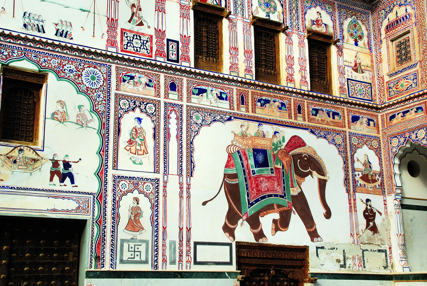 Au moment où l'Empereur Moghol Aurangzeb accède au trône en 1658, l'art de la miniature est à son plus haut degré de sophistication. Empereur cruel, il chasse de la cour les artistes et qui ensuite cherchent refuge auprès des demeures Hindous et surtout au Rajasthan. C'est alors que naît l'art de la peinture murale qui s'enrichira peu à peu en empruntant les scènes de la vie quotidienne des villageois puis plus tard l'époque coloniale, en assimilant l'influence Occidentale. Nul par ailleurs qu'au Shekhawati, cette région désertique du Rajasthan, l'art n'aura si prospéré.