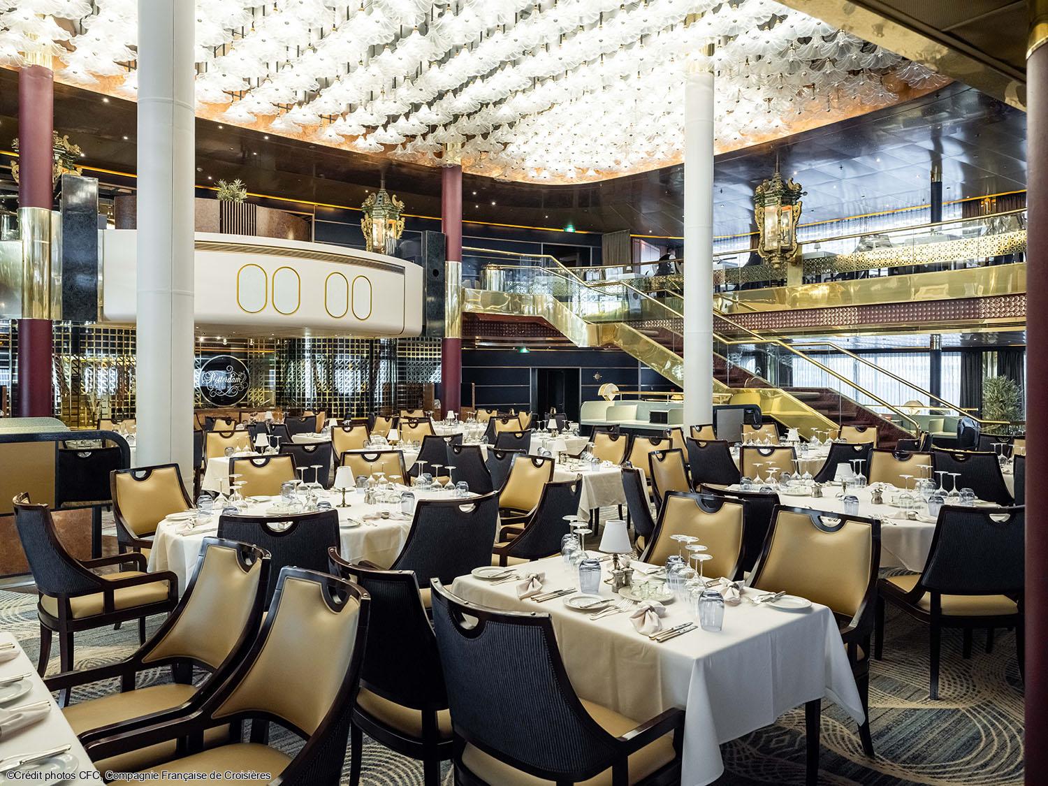 Au cœur du navire, une épopée culinaire attend les passagers. Le Grand Restaurant Vatel, sans frais supplémentaires, sert ses repas dans un cadre élégant, tandis que le Restaurant Buffet Belle-Île offre détente et douceur. Cependant, pour les gastronomes en quête d'aventures culinaires plus exotiques, le Restaurant Saïgon invite à un voyage aux saveurs asiatiques, le Louchébem promet une expérience carnivore inégalée avec son célèbre « Terre & Mer », et la Table du Chef offre une expérience culinaire gastronomique, chaque plat étant un hommage aux paquebots français d'antan, mais avec supplément.