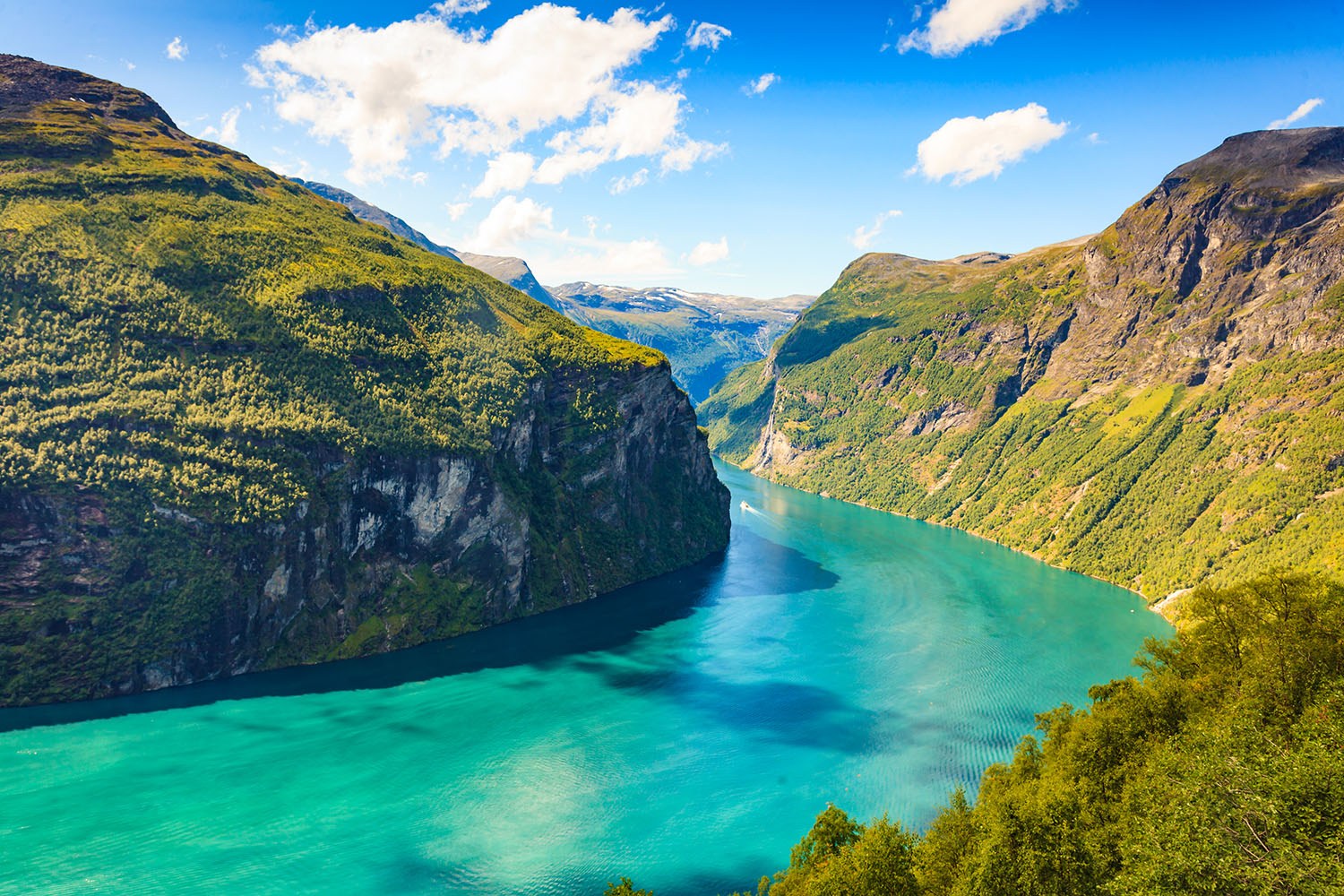 Le Geirangerfjord figure sur la liste du patrimoine mondial de l'UNESCO. D'un bleu profond, il se faufile dans un paysage verdoyant, ponctué de cimes enneigées, de falaises vertigineuses et de cascades spectaculaires.