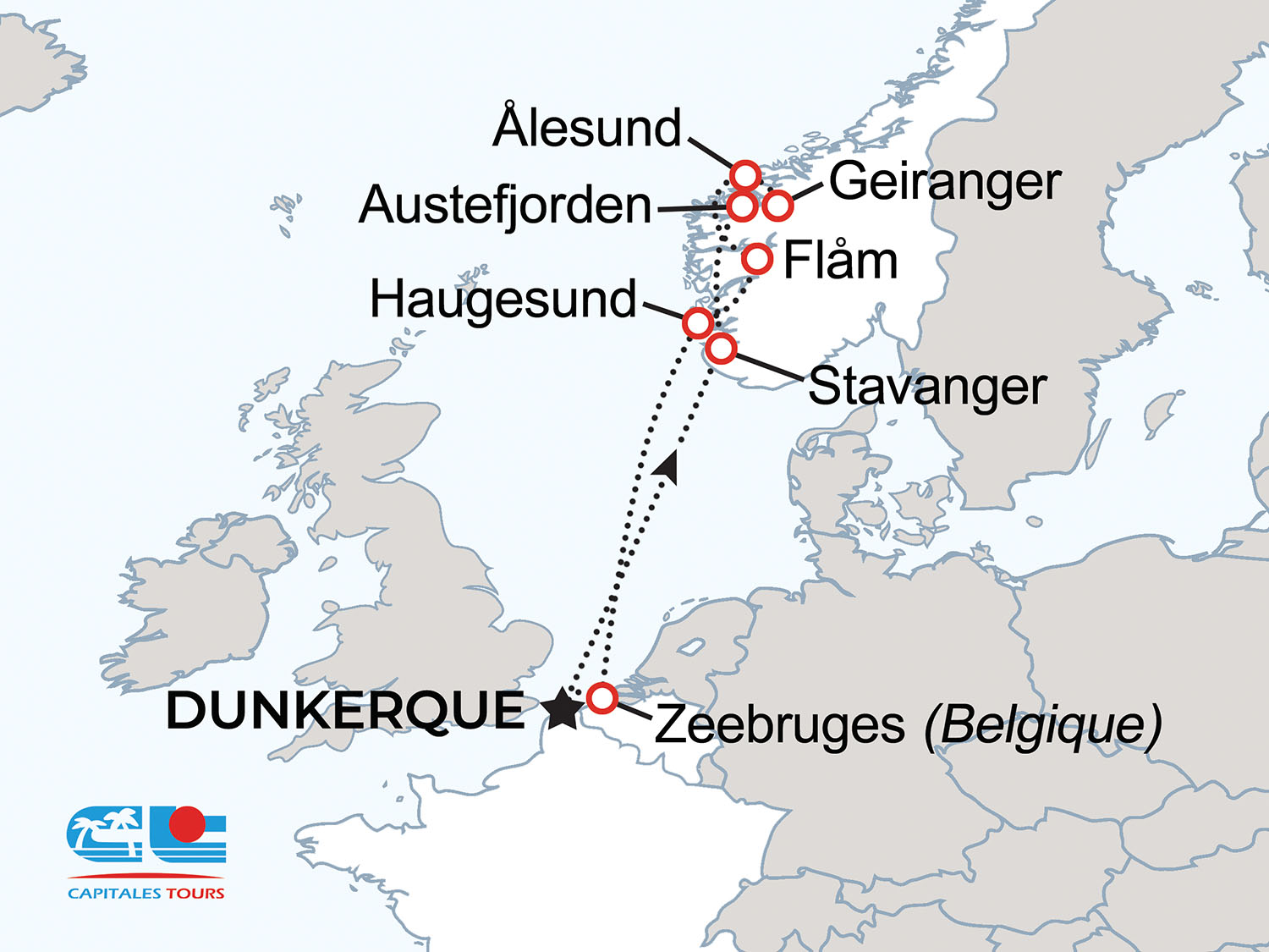 Renaissance vous embarque pour les fjords les plus grandioses de Norvège. Votre première escale aura lieu à Stavanger, où ruelles pavées et paysages spectaculaires se côtoient, avant de remonter l’impressionnant Austefjorden, véritable joyau naturel. Puis vous mettrez le cap sur Geiranger, célèbre pour son fjord classé au Patrimoine mondial de l’UNESCO, aux cascades vertigineuses et panoramas inoubliables. À Ålesund, vous serez séduits par l'architecture Art Nouveau et les vues imprenables depuis le mont Aksla. À Flåm, vous embarquerez pour un voyage féerique à travers le chemin de fer qui serpente entre montagnes et vallées. Ensuite, vous découvrirez Haugesund, berceau des premiers rois vikings, avant un dernier arrêt à Zeebrugge, porte d’entrée vers la ville médiévale de Bruges. Profitez aussi d'une journée en mer pour vous détendre face à l’immensité nordique.