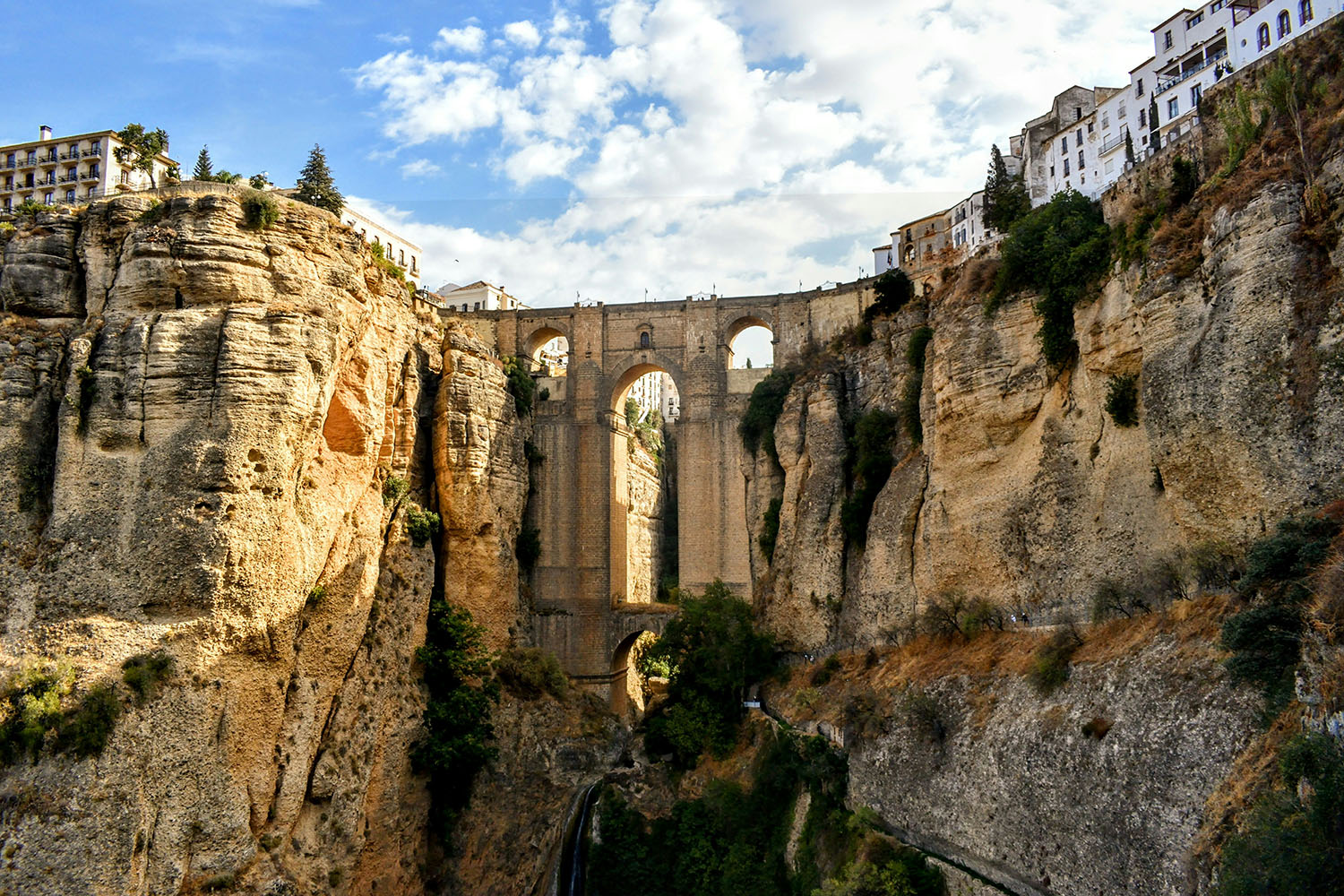 Le pont neuf est l’une des attractions de la ville avec son précipice impressionnant qui sépare la vieille ville de la partie plus récente. Ronda est bâtie sur un plateau entaillé par une gorge profonde. En raison de sa situation, la ville fut l’un des derniers bastions musulmans en Andalousie. L’ancienne ville Maure est caractéristique des villages Blancs d ‘Andalousie.