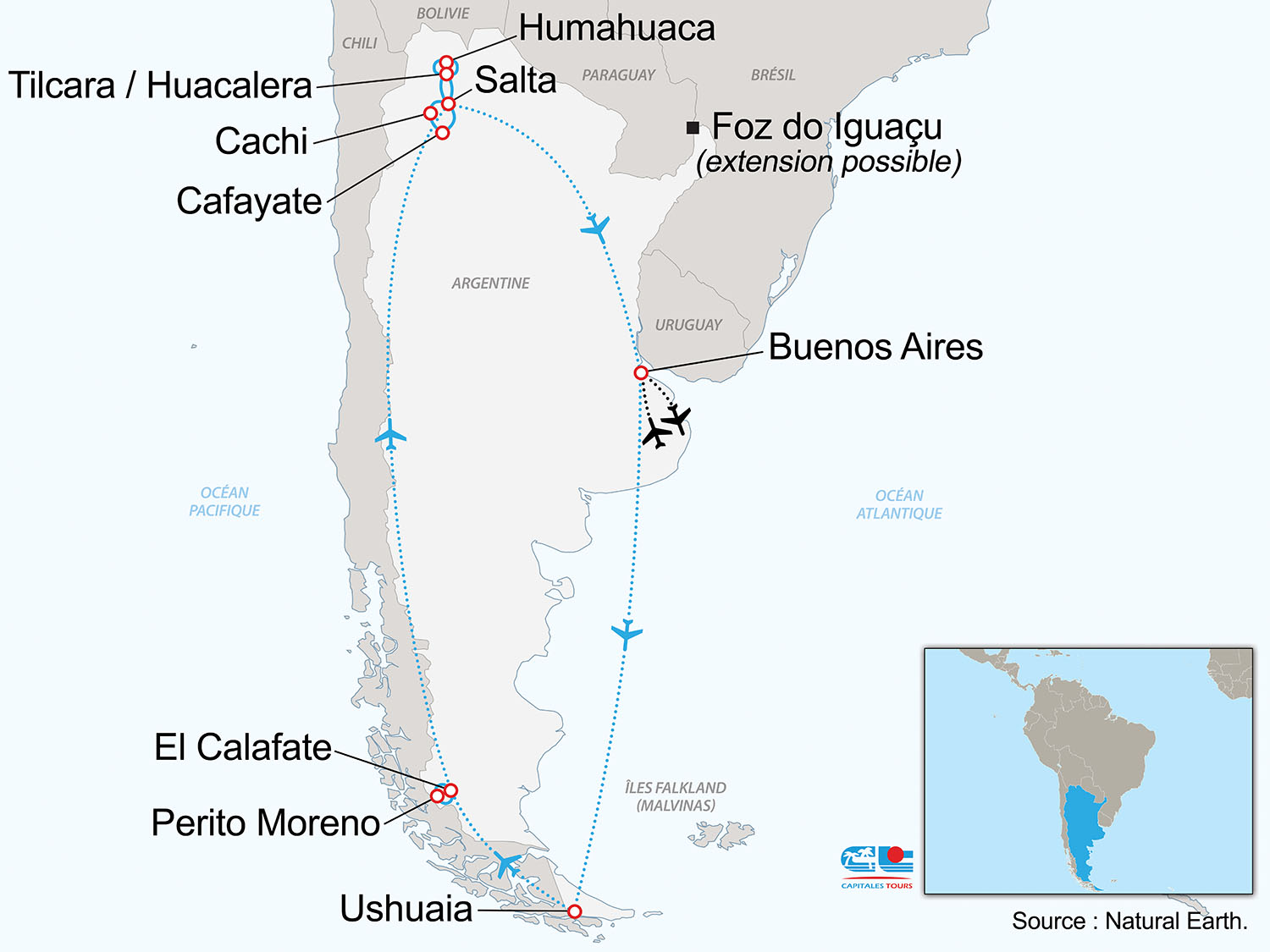 • Vols intérieurs : Buenos Aires /Ushuaia / El Calafate / Salta / Buenos Aires sur vols Aerolineas Argentinas (les vols peuvent donner lieu à une escale)
