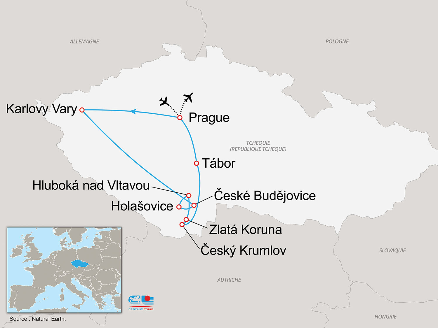 • Aérien : France / Prague / France ou inversement sur vols réguliers ou low-cost Transavia, Easyjet, Wizz Air, Lufthansa ou Air France/KLM, Smartwings (les vols peuvent être avec ou sans escale à l’aller comme au retour)