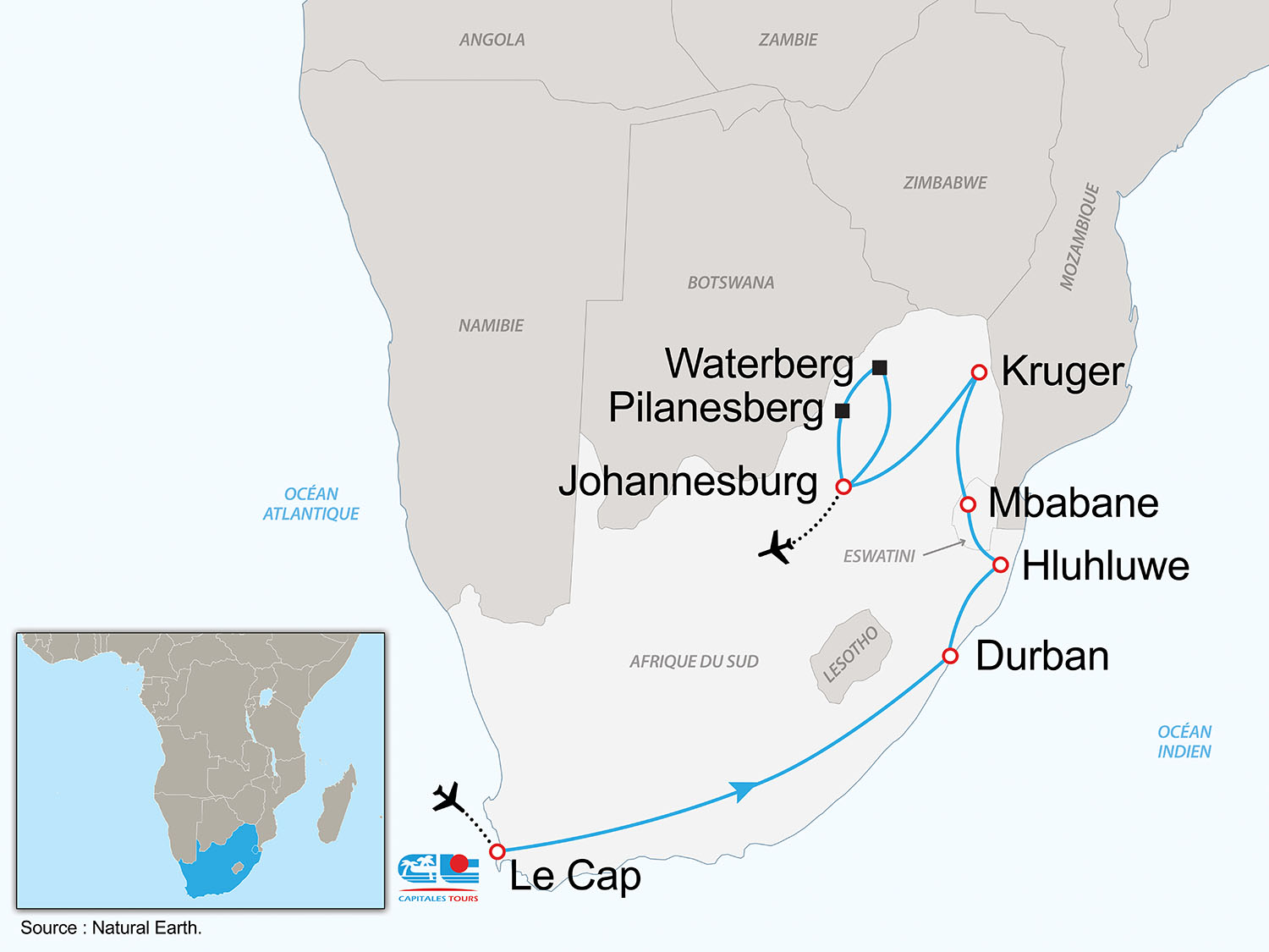 • Aérien : France / Le Cap // Johannesburg / France sur vol régulier Air France et/ou KLM via Amsterdam ou Emirates via Dubaï