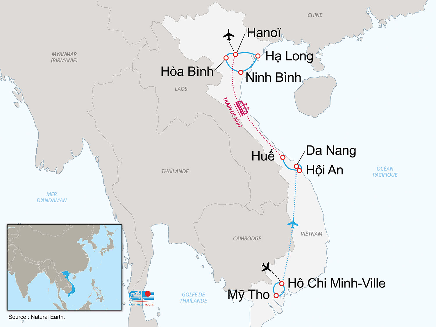 • Aérien : France / Hô Chi Minh Ville et Hanoi / France sur vols réguliers Turkish Airlines via Istanbul ou Eva Air via Taipei