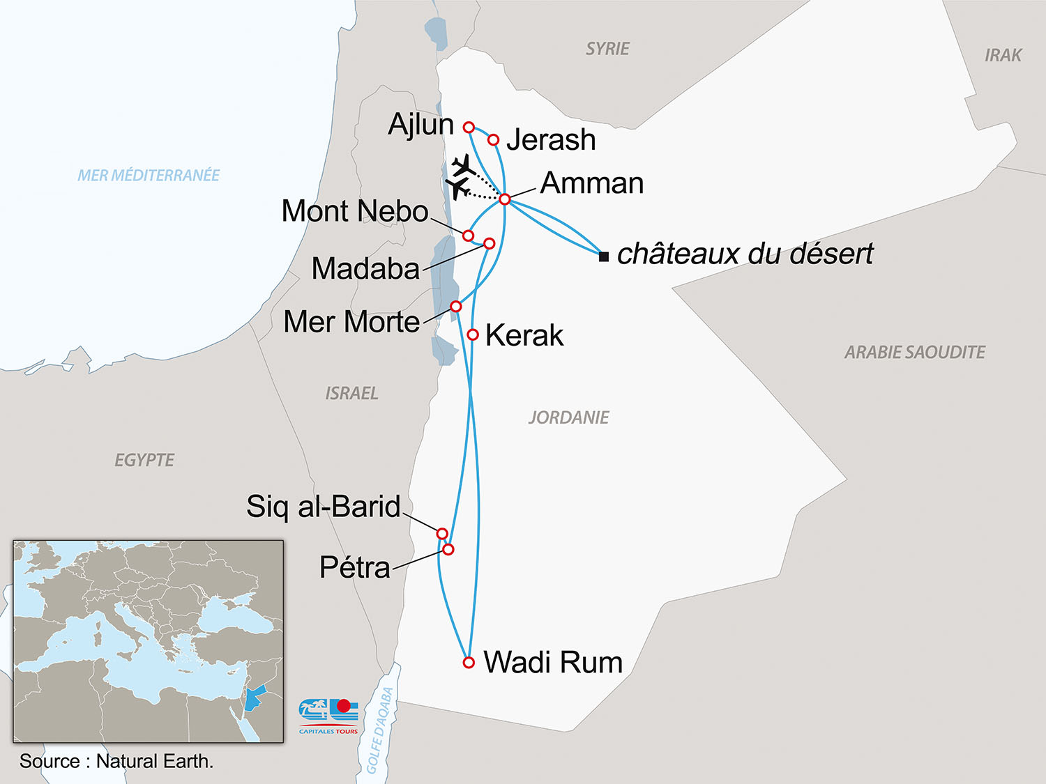 • France / Amman / France sur vols réguliers Air France, Royal Air Jordanian, Lufthansa, Austrian Airlines, Turkish Airlines, Egyptair (ces vols peuvent donner lieu à une escale)